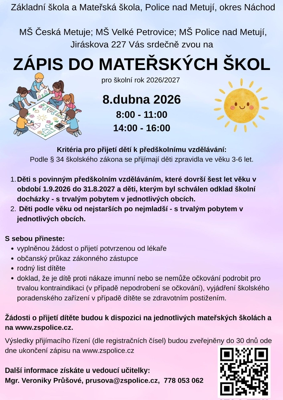 ZŠ a MŠ Police nad Metují - zápis do mateřských škol na školní rok 2026/2027
